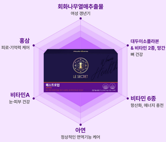 뉴트리원 르시크릿 에스트로업 포 우먼은 식약처에서 갱년기 여성의 갱년기 증상 완화에 도움을 줄 수 있다는 기능성을 인정받은 건강기능식품입니다.